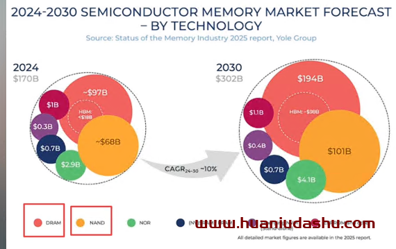 dram 是红色的圆圈,nand 是黄色的源圈。数据上看,二零二五年的展望d rem是一千两百九十亿美金啊,net是六百五十亿美金H B M预计到二零二五年将达到三百九十亿美金,预计到二零三零年将达到九百八十亿美金。